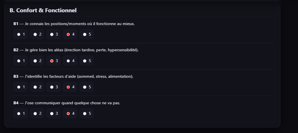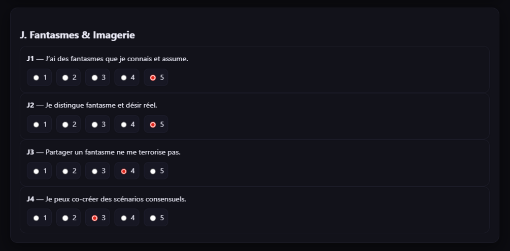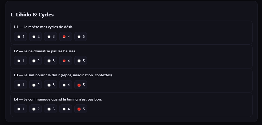 Rituel d’intro, questions guidées, score automatique par axes (image, anxiété, désir, porno, kinks, communication…).